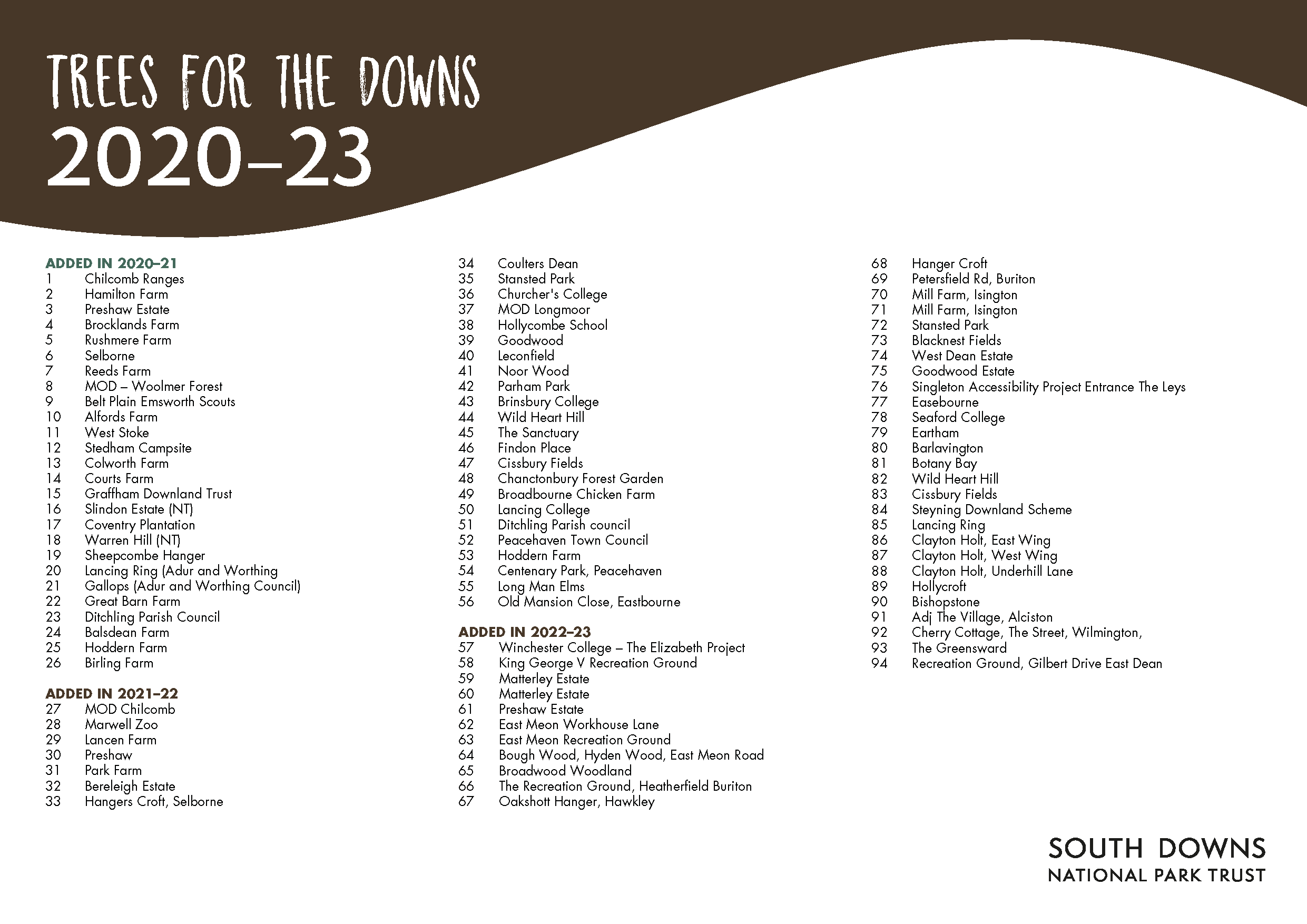 The fund supplies trees  and suitable protection for the young sapling, such as canes and guards, to sites within the South Downs National Park.  Check here: Do I live in the National Park? – South Downs National Park Authority  The recipient is responsible for the planting and their ongoing care.
